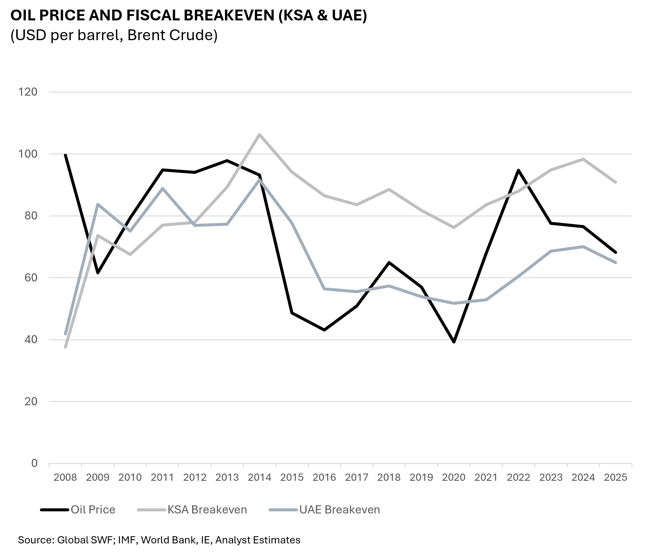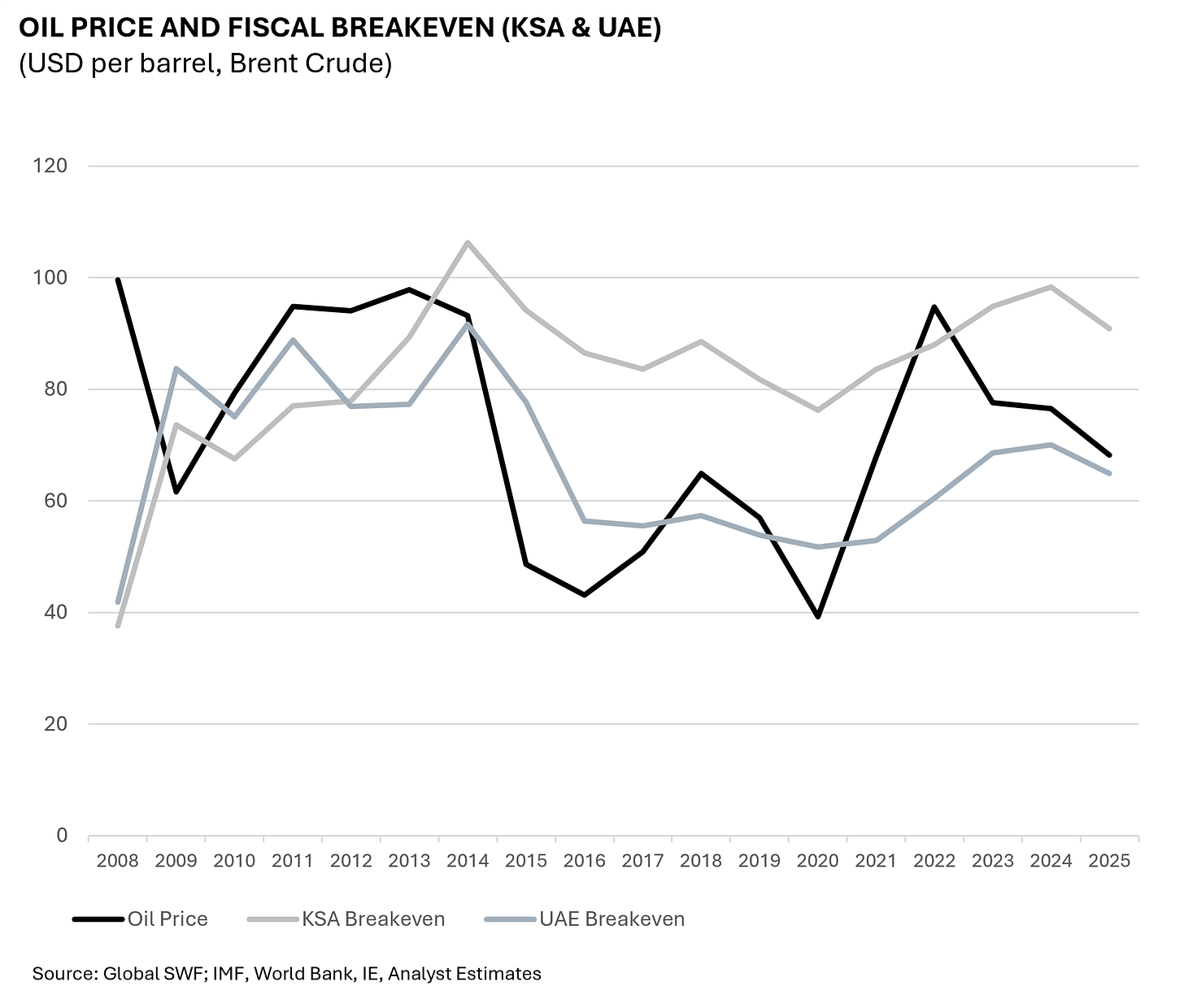 As AI ambitions grow and real estate megaprojects scale, the breakeven rises — not just in theory, but in practice. Saudi Arabia and the UAE are now navigating a landscape where domestic obligations crowd out global optionality. The fiscal room to rebalance portfolios eastward is narrowing.